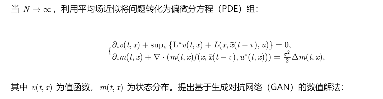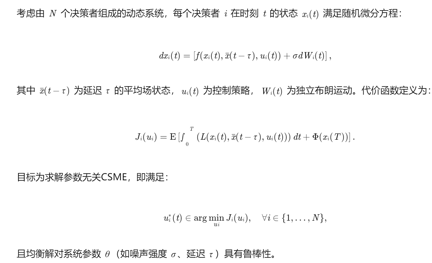 - 构建带延迟的随机MFG模型,引入延迟算子刻画决策响应滞后效应。
