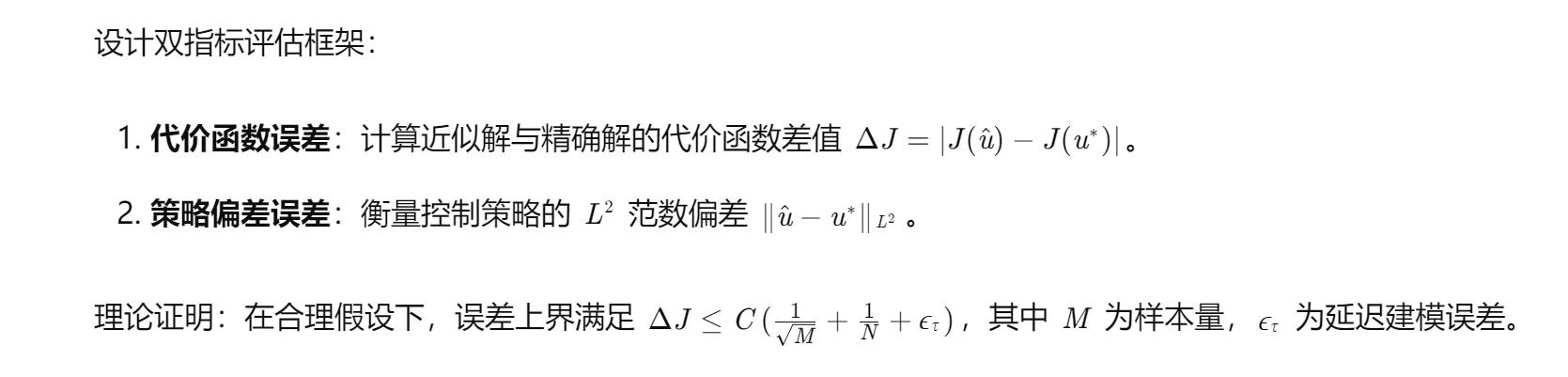 - 精确解与近似解对比:当 N=100 时,近似解的代价函数误差 ΔJ≤2.3%,策略偏差误差 ∥u^−u∗∥L2≤0.05。