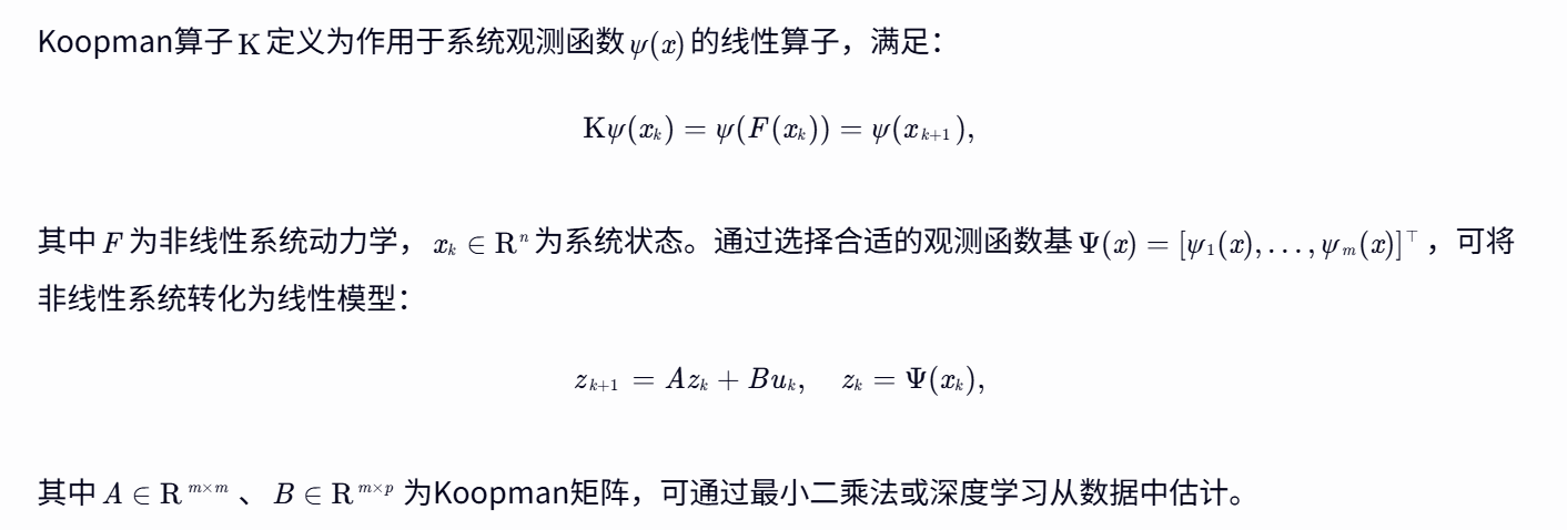 - 线性动力学层:在嵌入空间中应用Koopman算子zk+1=Azk+Buk;