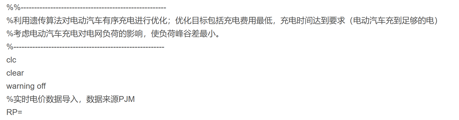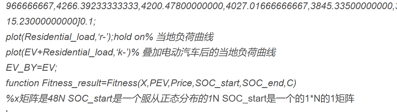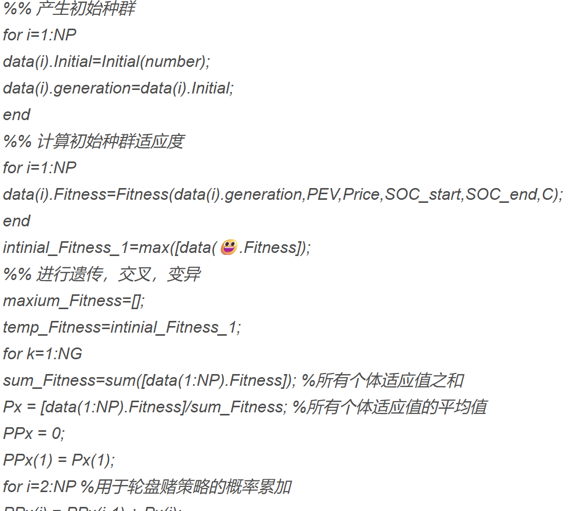 编码方式:采用实数编码,每个个体代表一组充电起始时刻(如24小时制下的0-23整数)。