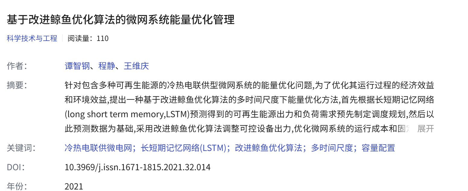 [1]谭智钢,程静,王维庆.基于改进鲸鱼优化算法的微网系统能量优化管理[J].科学技术与工程, 2021.DOI:10.3969/j.issn.1671-1815.2021.32.014.