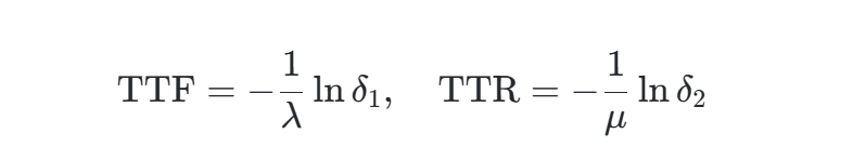 - 时序状态模拟:根据元件的故障率(λλ)和修复率(μμ),生成元件的持续工作时间(TTF)和修复时间(TTR)。计算公式为:
