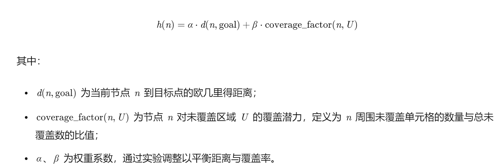 传统A*算法的启发函数通常采用曼哈顿距离或欧几里得距离,仅考虑当前节点到目标点的距离。在全覆盖任务中,需引入覆盖率指标,引导搜索优先覆盖未探索区域。本文设计动态启发函数: