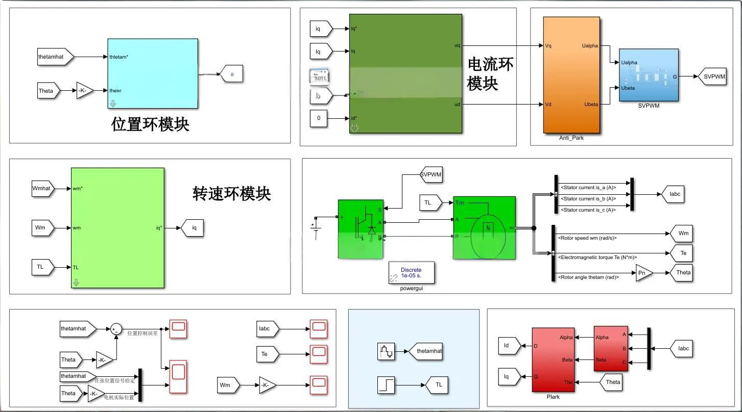 PMSM三环伺服系统从内到外依次为电流环、速度环和位置环。电流环作为最内环,负责快速、准确地跟踪电流指令,实现对电机转矩的精确控制;速度环根据位置环输出的速度指令,调节电机转速,保证速度的稳定性和准确性;位置环作为最外环,根据给定的位置指令,输出速度指令,实现电机的精确定位。三个环路相互协作,共同完成PMSM的高精度位置控制任务。