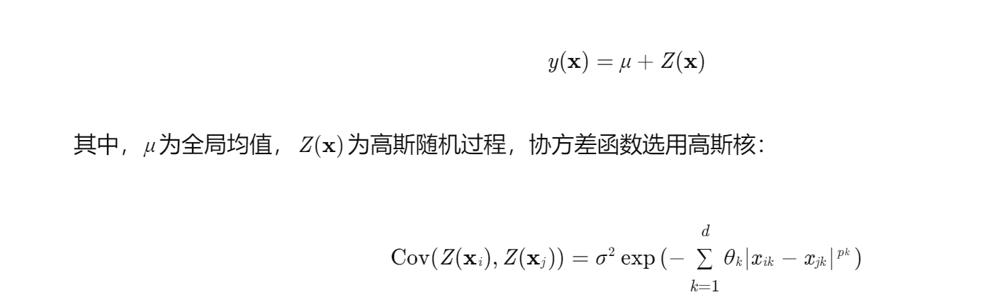 克里金模型是一种基于地质统计学的空间插值方法,通过“全局趋势+局部随机波动”的双组分建模,实现非线性复杂系统的高精度响应面拟合。其数学表达式为: