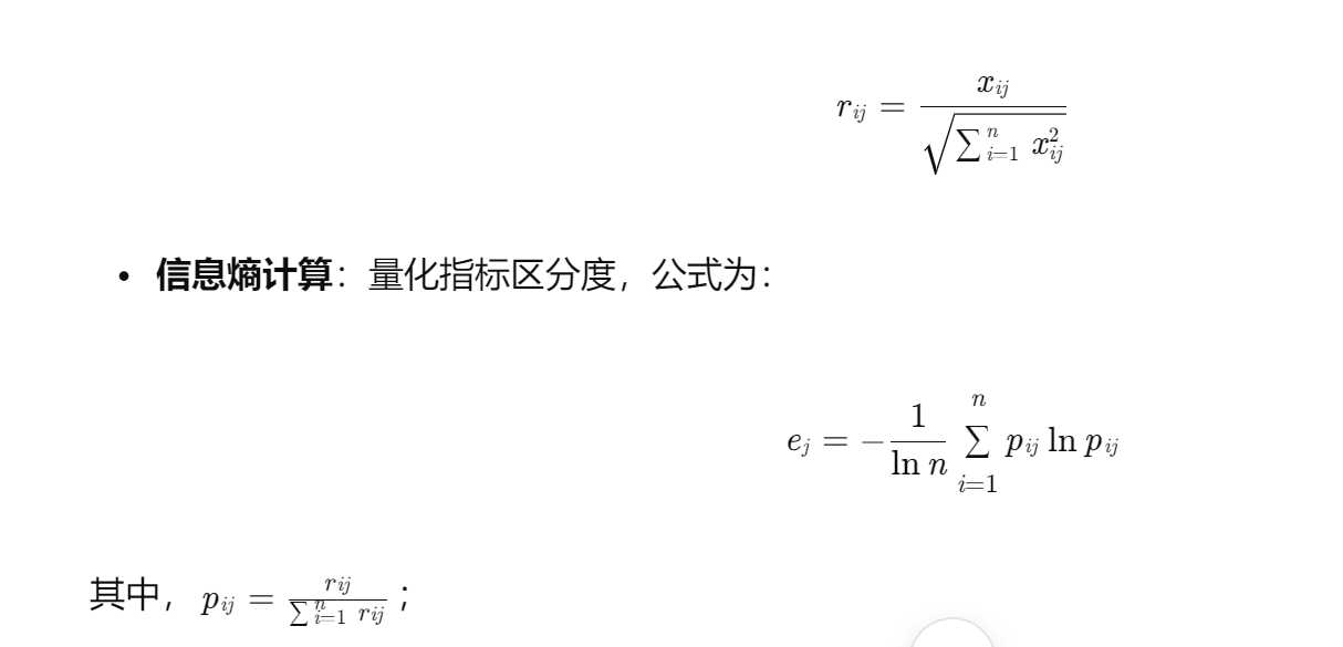TOPSIS(Technique for Order Preference by Similarity to Ideal Solution)通过计算各方案与理想解(最优解)和负理想解(最劣解)的相对接近度进行排序。熵权法是一种客观赋权法,根据指标数据的变异程度确定权重: