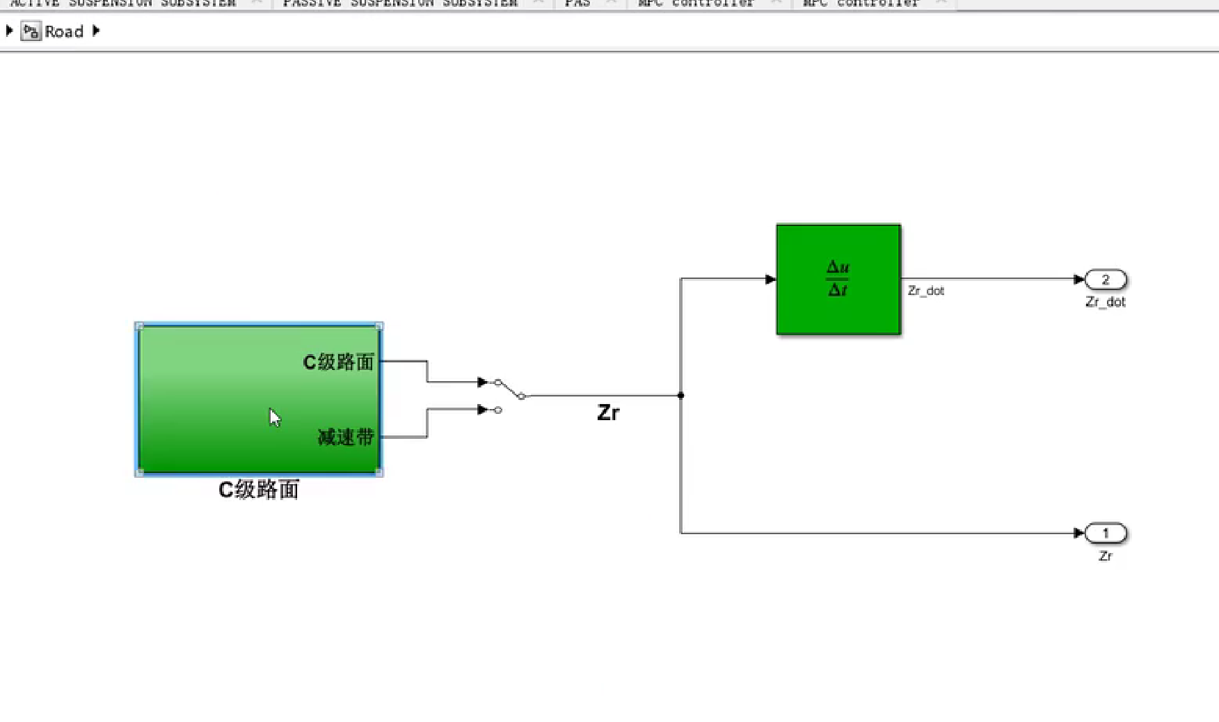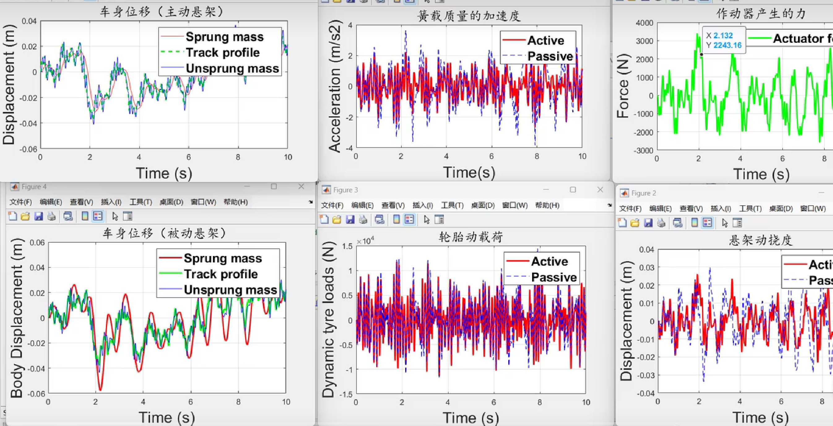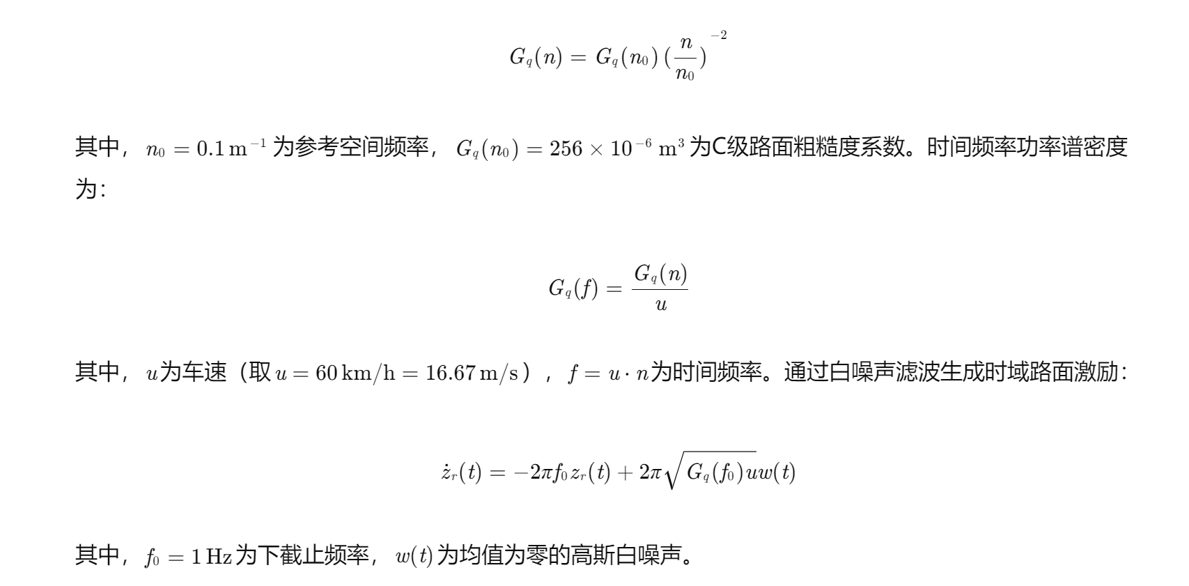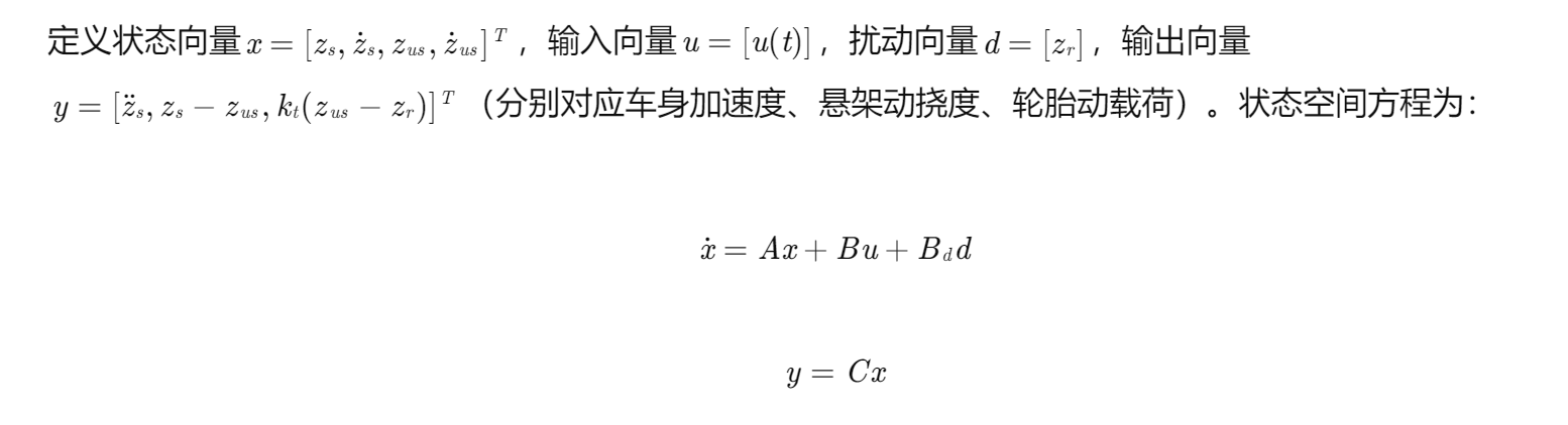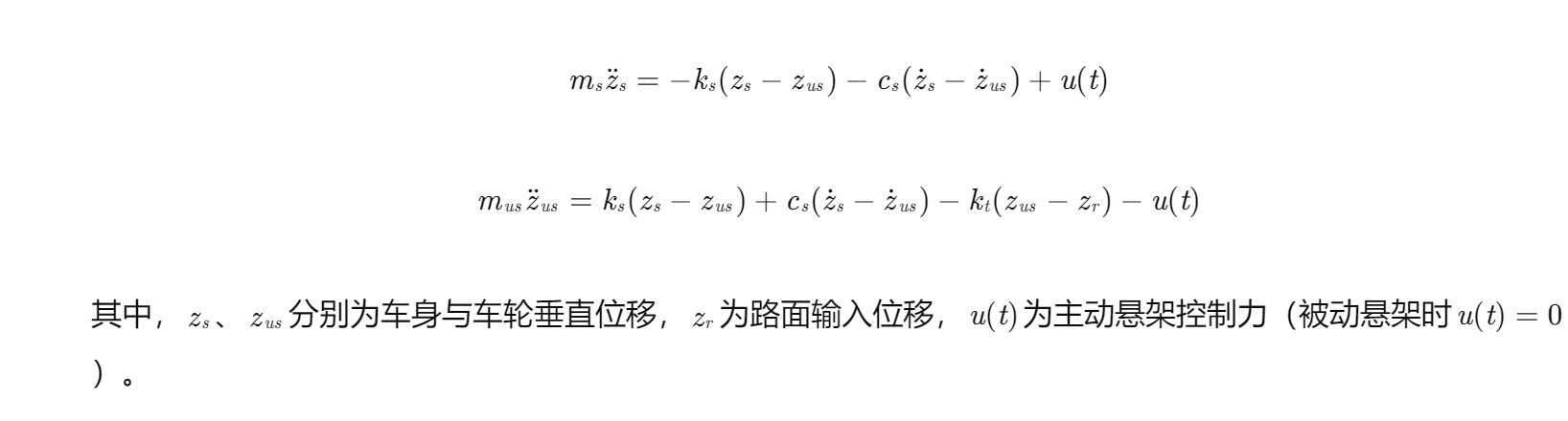 - 车辆动力学模块:实现状态空间方程,输入为控制力u(t)与路面激励zr(t),输出为状态变量x与性能指标y。