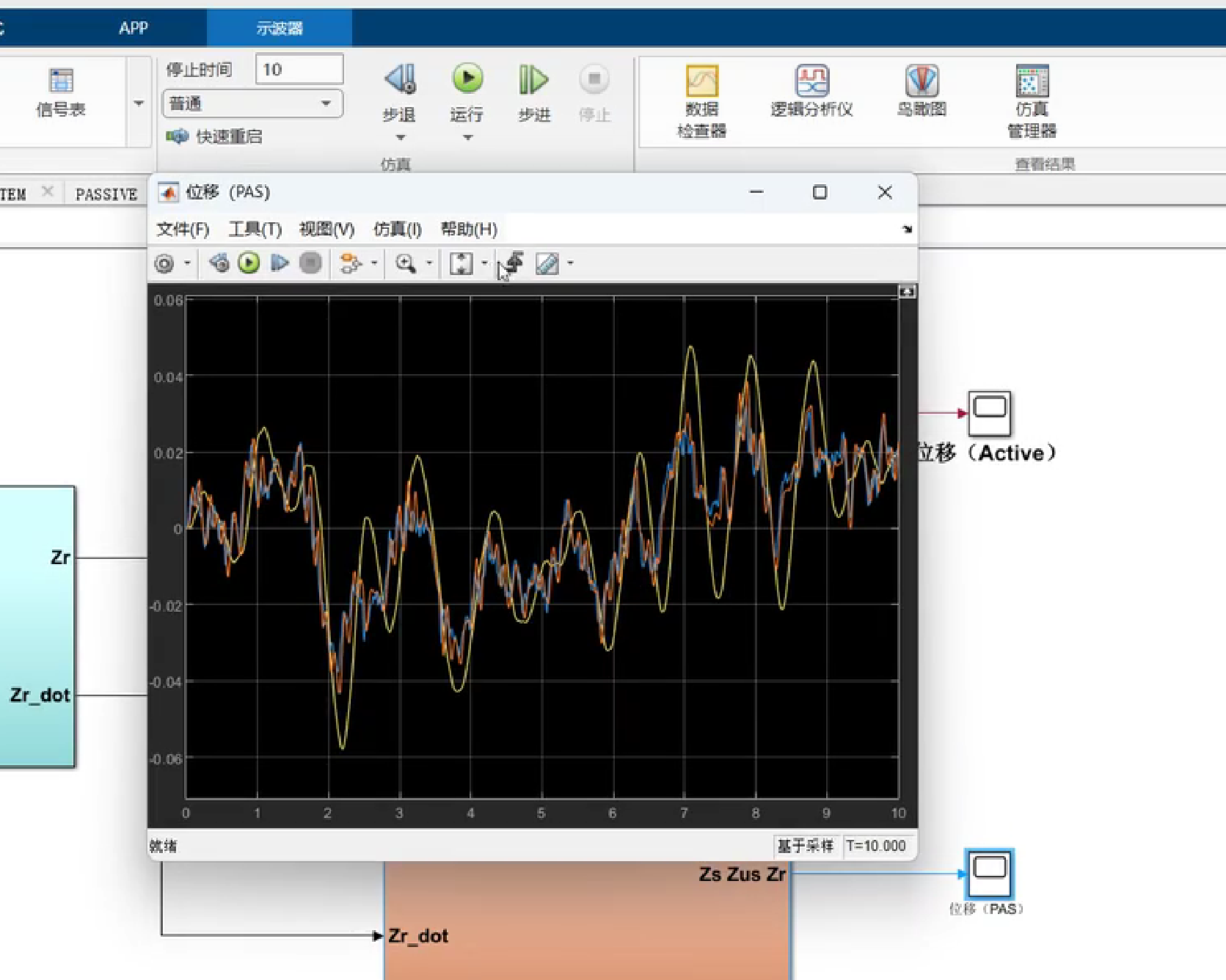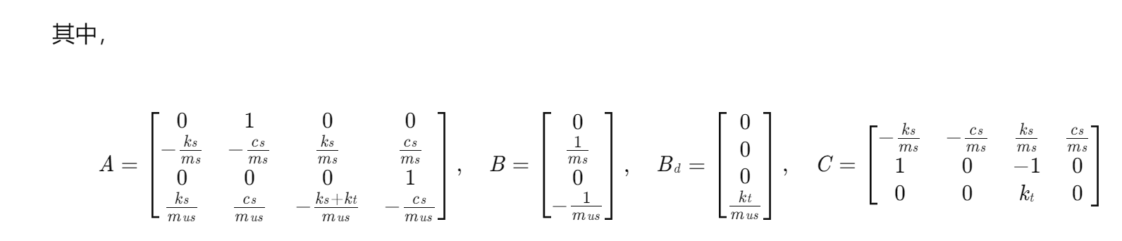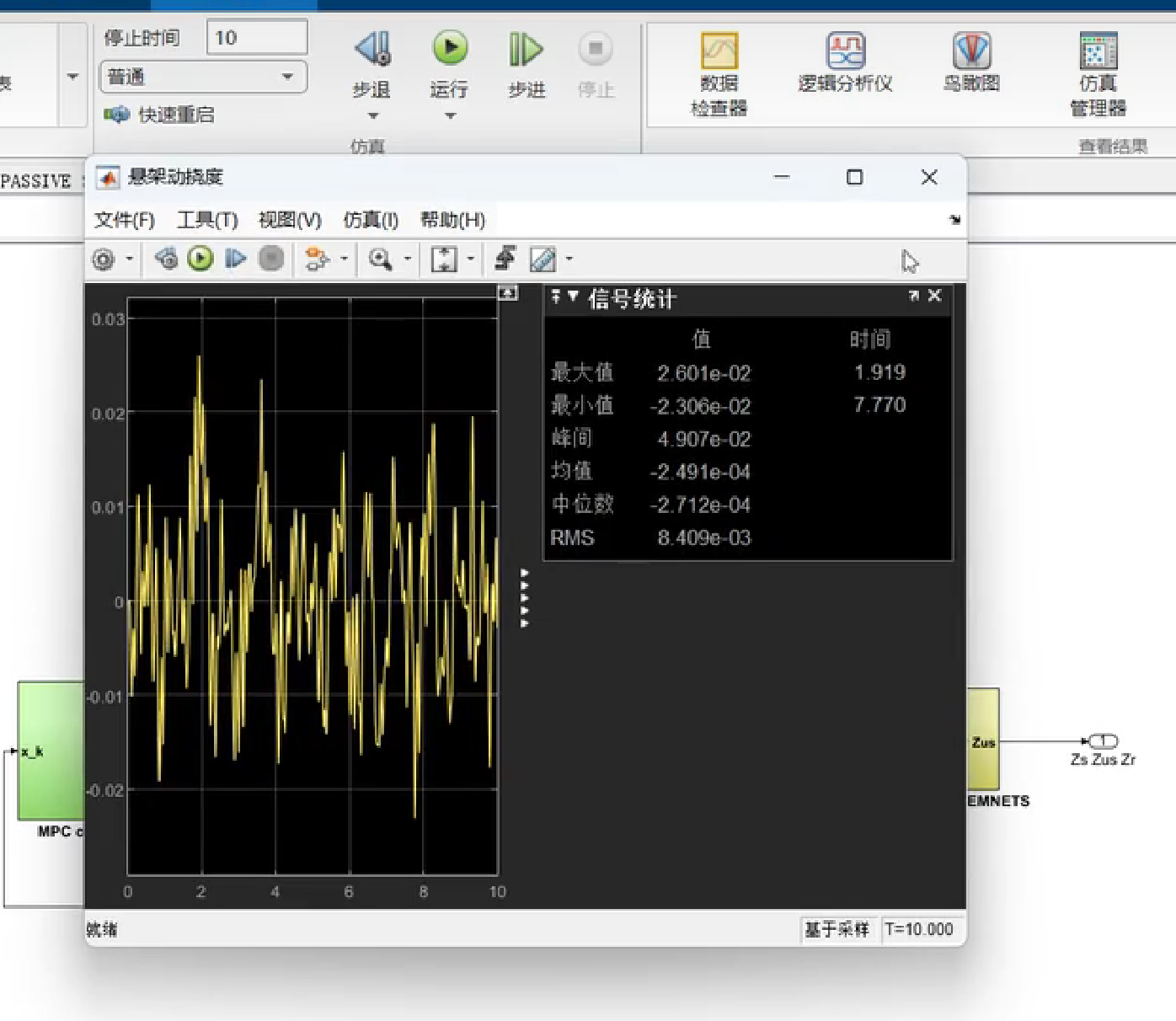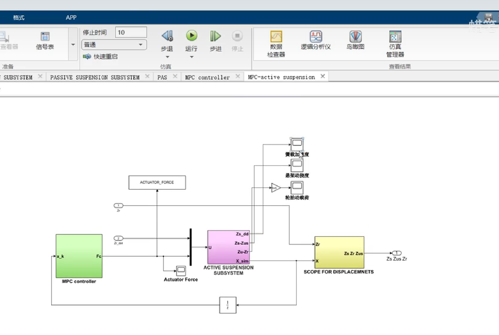 - 车辆动力学模块:实现状态空间方程,输入为控制力u(t)与路面激励zr(t),输出为状态变量x与性能指标y。