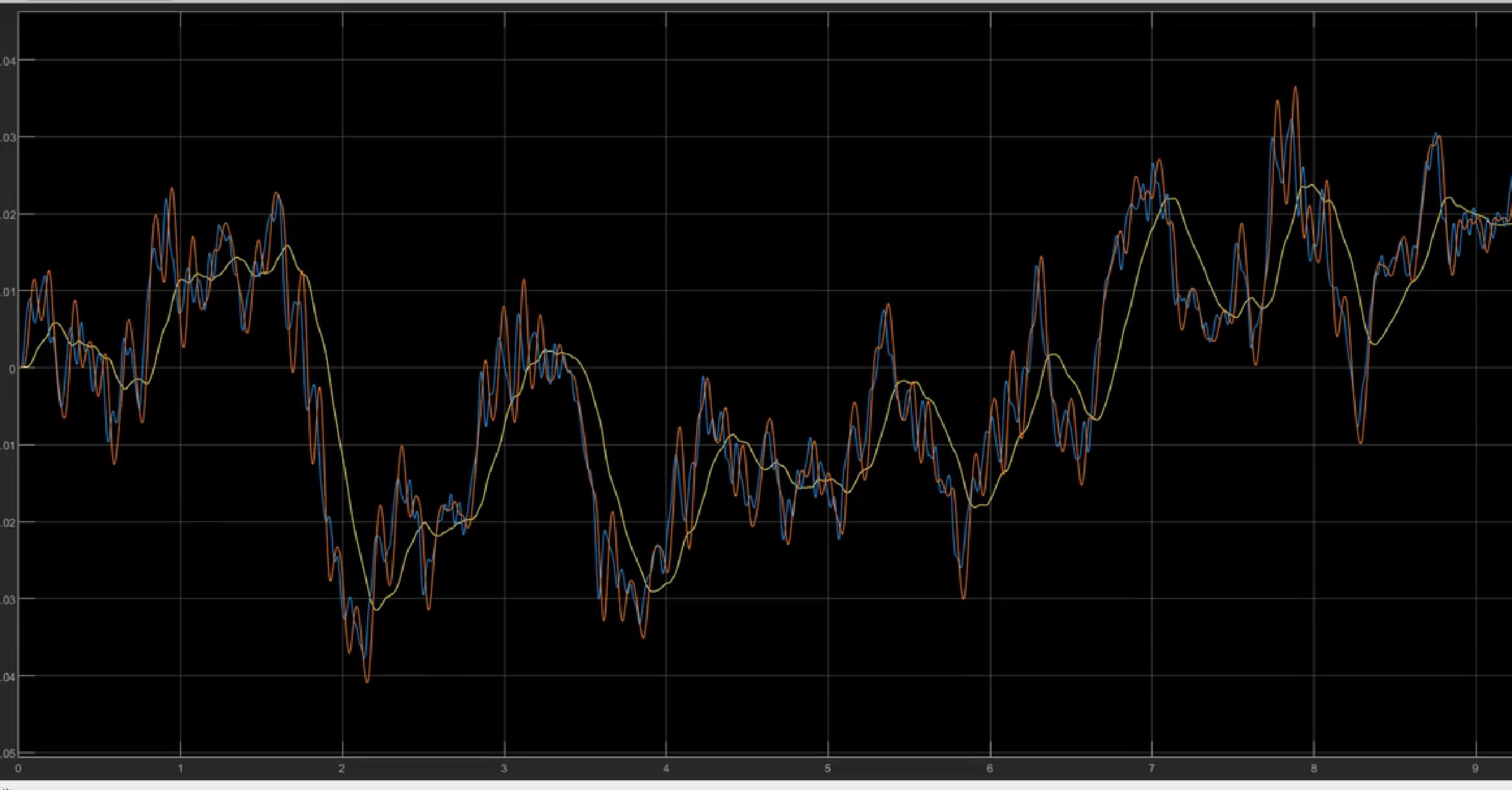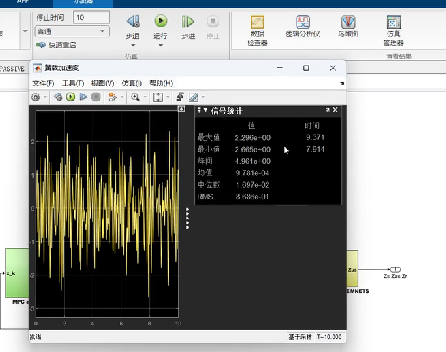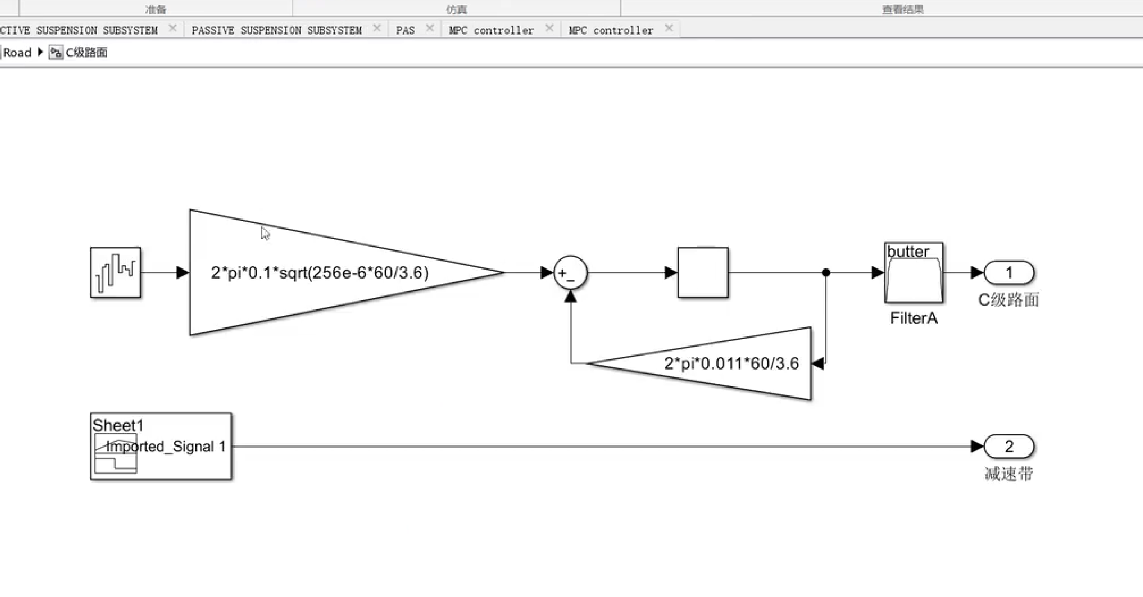 mpc命令定义控制器参数(如Np=20、Nc=10、Q=diag([1000,1,10])、R=1),通过mpcmove函数求解最优控制序列。 - 路面激励模块:生成C级随机路面与减速带冲击路面信号。