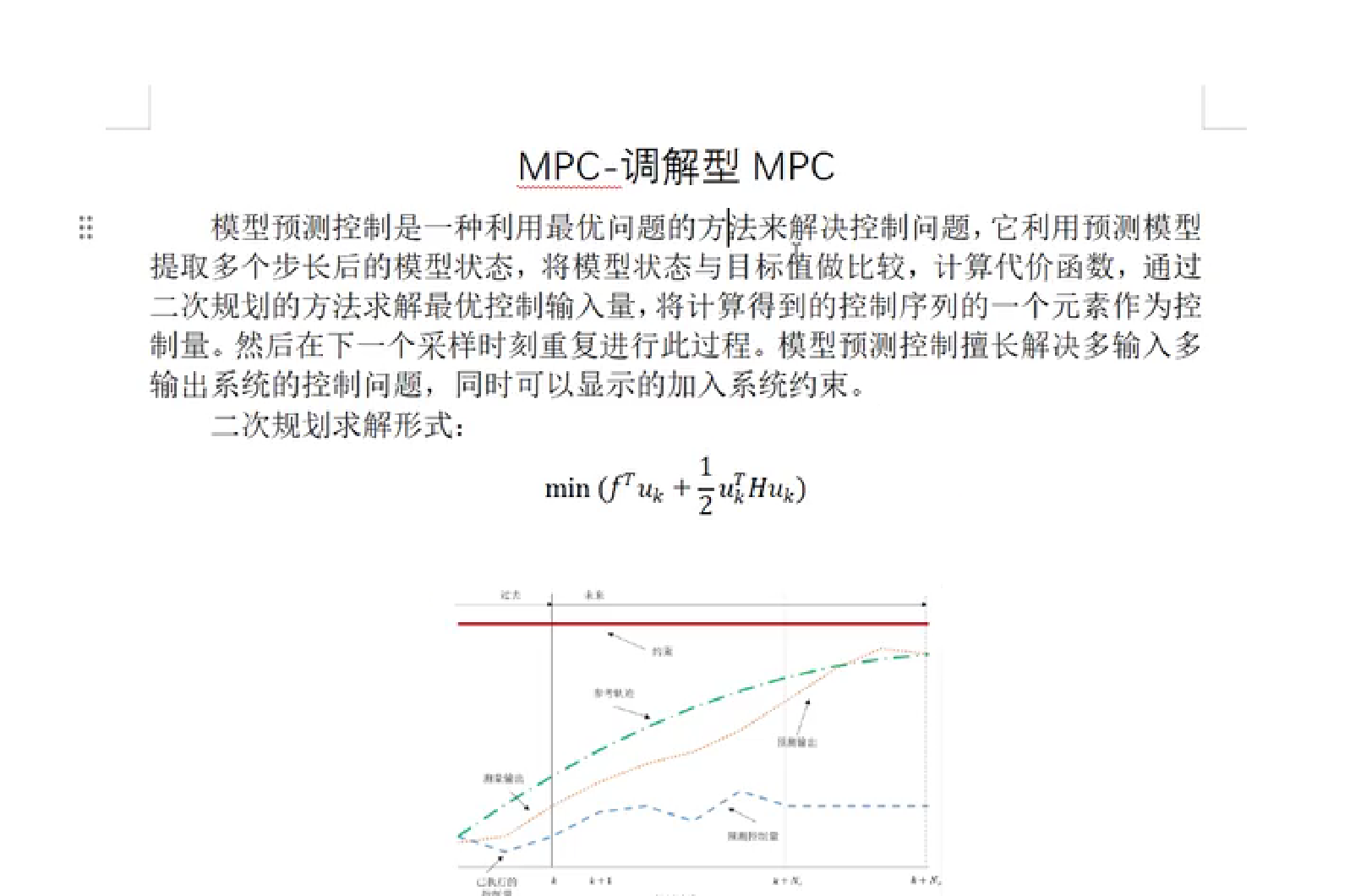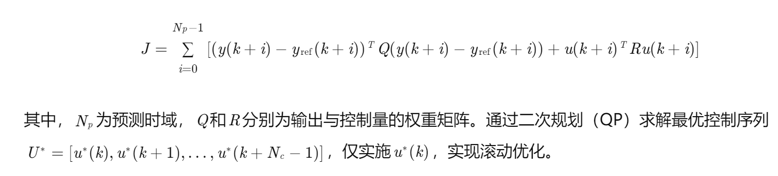 - 滚动优化:在每个采样时刻,以预测输出与参考轨迹的偏差最小化为目标,求解有限时域内的最优控制序列,仅实施当前控制量,下一时刻重新优化。