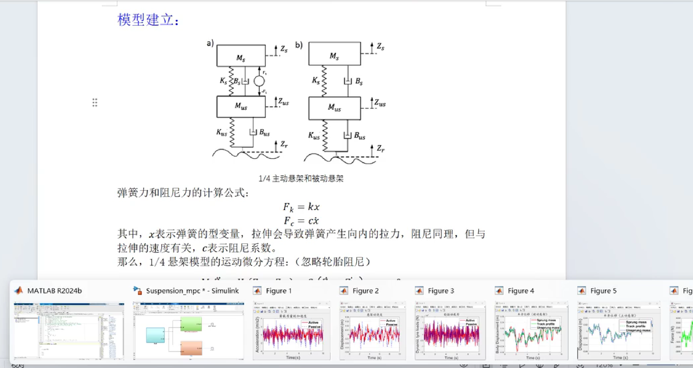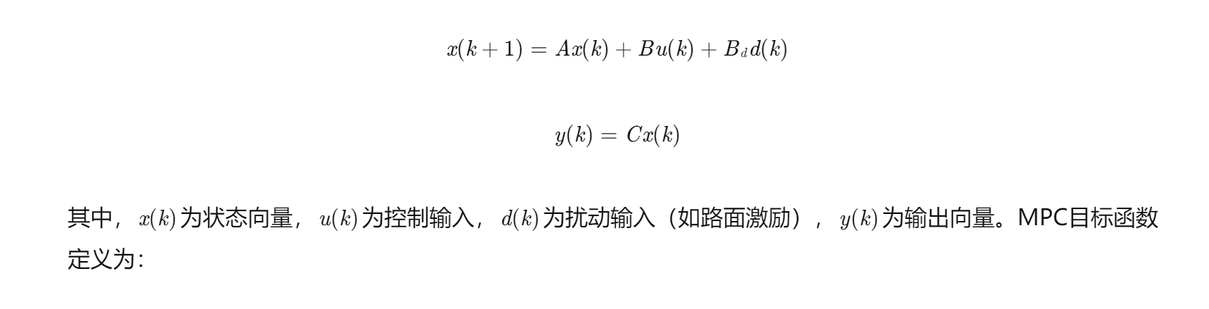 现有研究已广泛验证MPC在主动悬架控制中的有效性。例如,某研究通过四自由度半车模型,结合PSO优化MPC权重矩阵,显著降低了车身加速度与悬架动挠度;另一研究针对货车复杂路况,设计自适应模糊滑模控制(AFSMC)与MPC的混合策略,在提升舒适性的同时优化了馈能效率。然而,现有研究多聚焦于高自由度模型或特定工况,对2自由度1/4模型在典型路面下的性能对比分析仍显不足。本研究通过简化模型与典型路面激励,系统评估MPC主动悬架的基础性能,为工程应用提供参考。