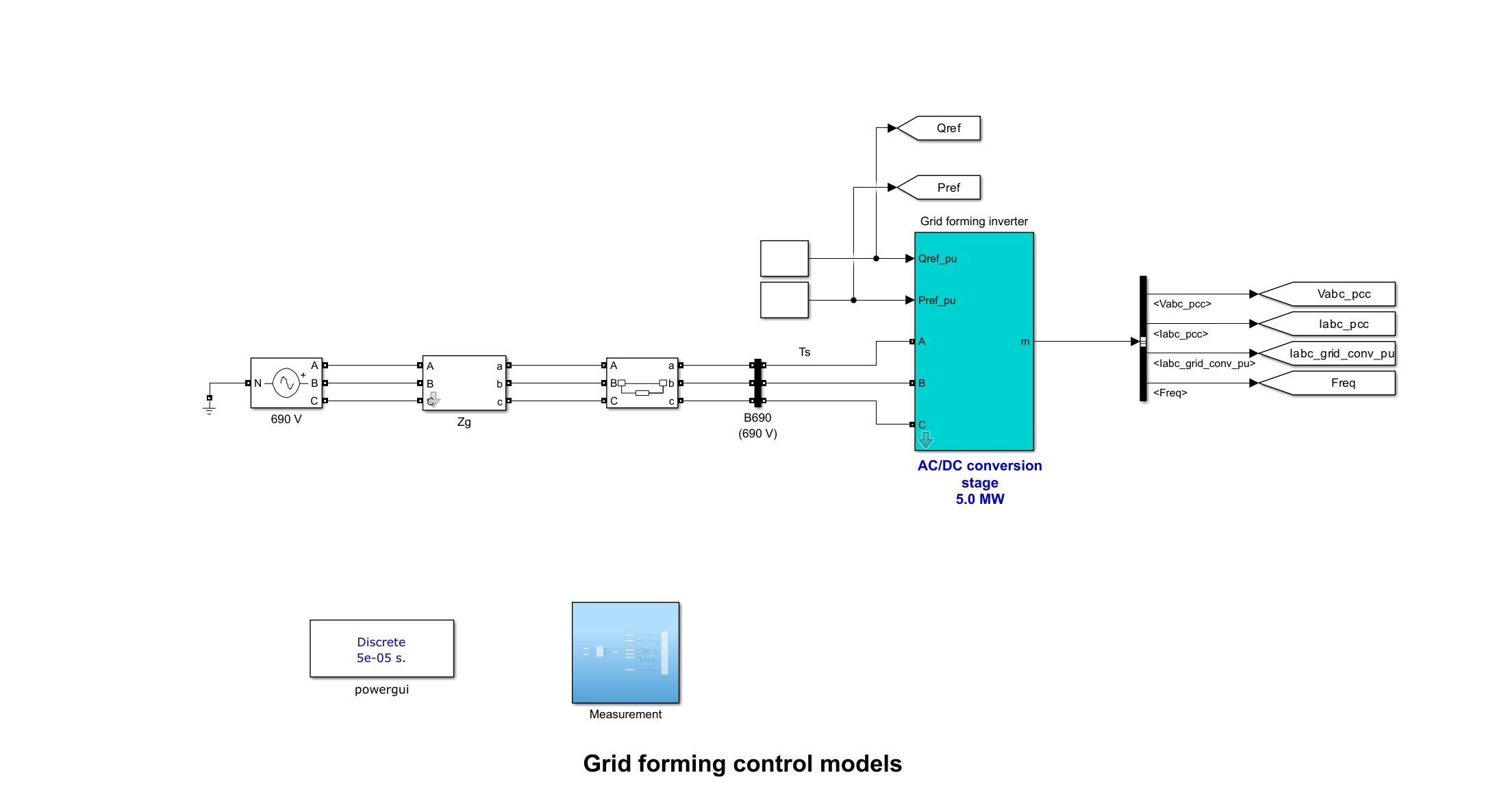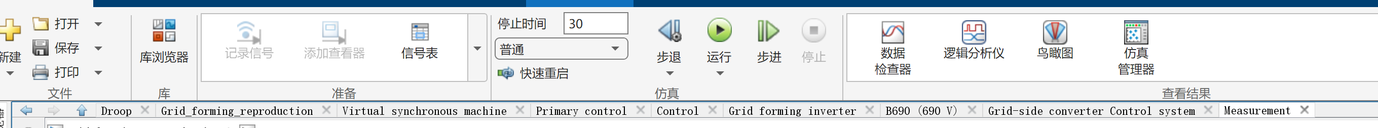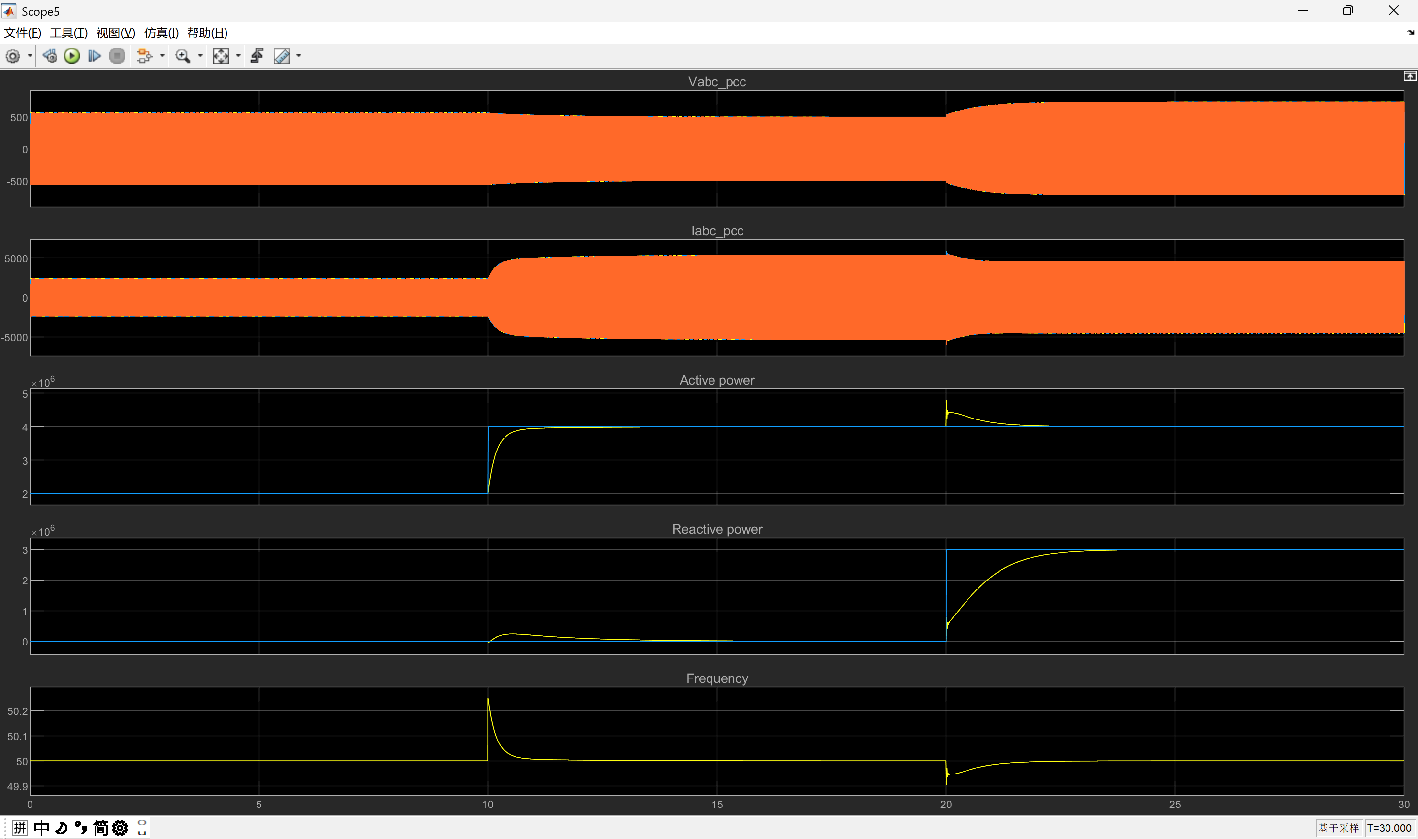 - 扰动施加模块:通过“690 V”电压源模块实现电压跌落(30%幅值)、频率阶跃(±0.5 Hz)及相位跳变(±10°)。