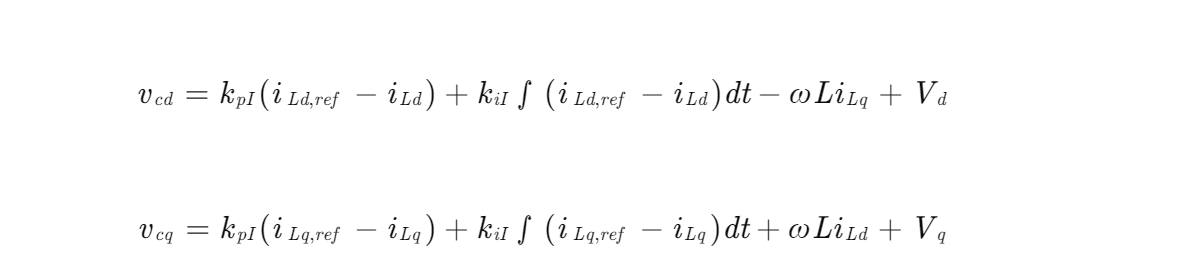 其中,vcd 和 vcq 分别为逆变器输出电压的 d 轴和 q 轴分量,iLd 和 iLq 分别为电感电流的 d 轴和 q 轴分量,kpI 和 kiI 分别为电流内环的比例系数和积分系数,L 为滤波电感,Vd 和 Vq 分别为电网电压的 d 轴和 q 轴分量。