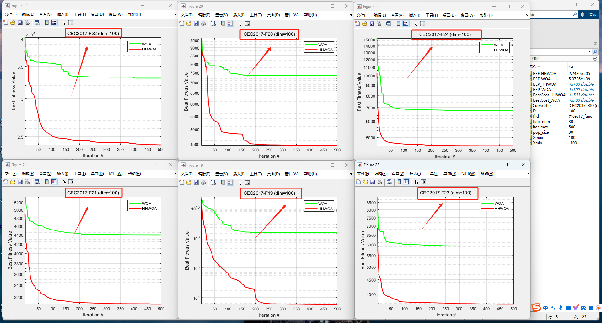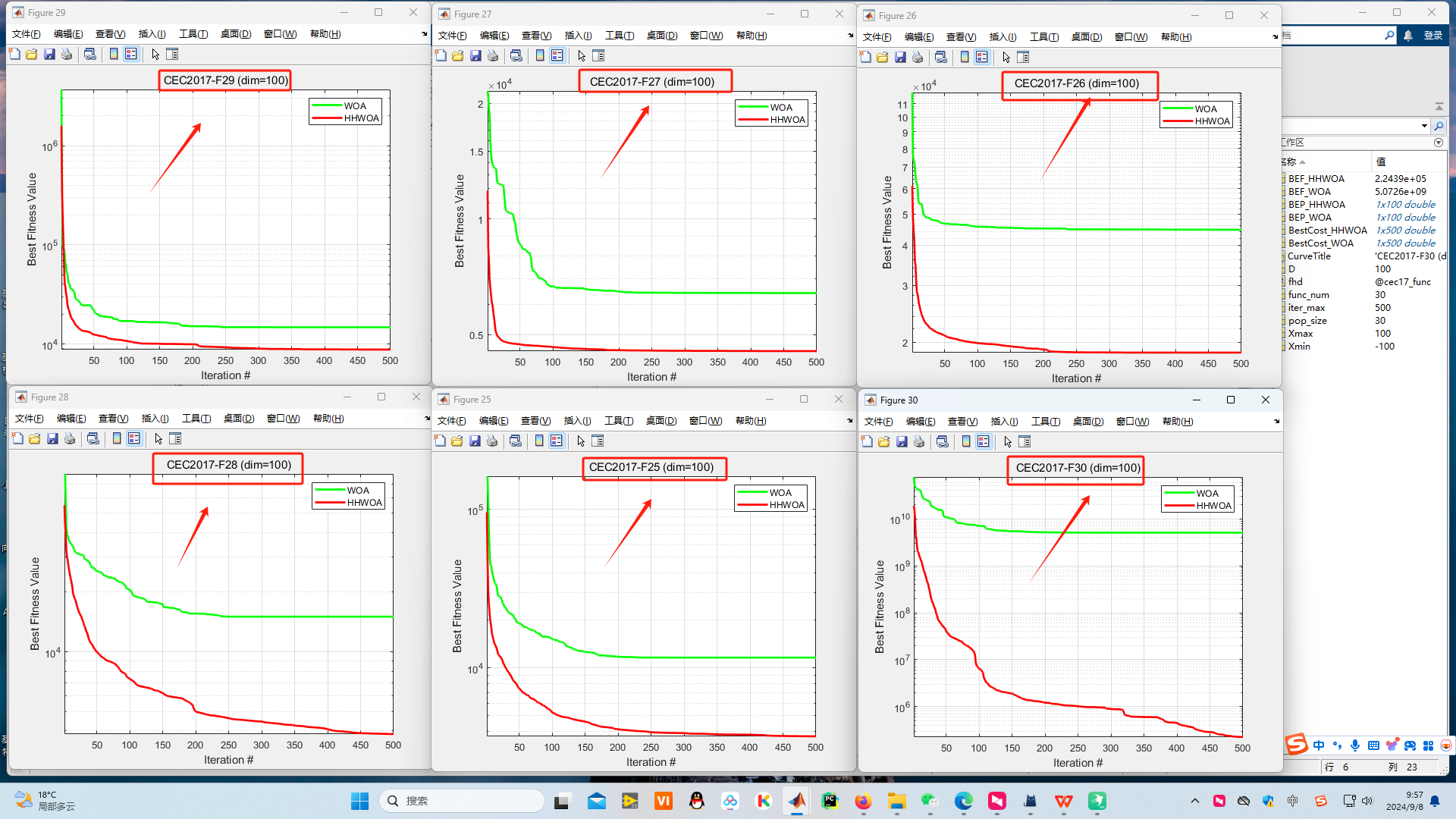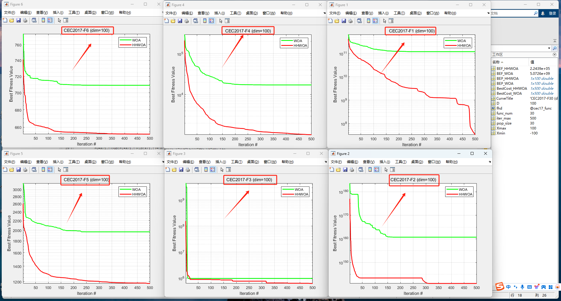 多策略改进鲸鱼优化算法(HHWOA)与鲸鱼优化算法(WOA)在CEC2017测试集函数F1-F30的寻优对比研究