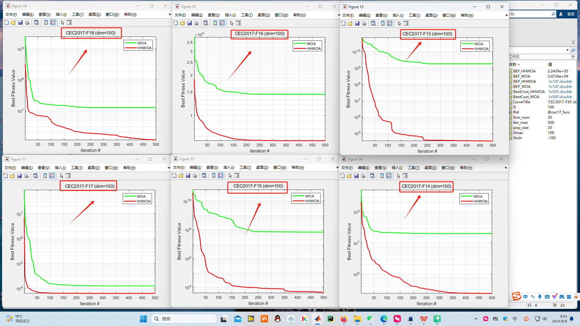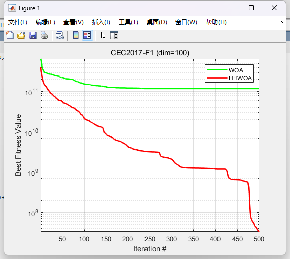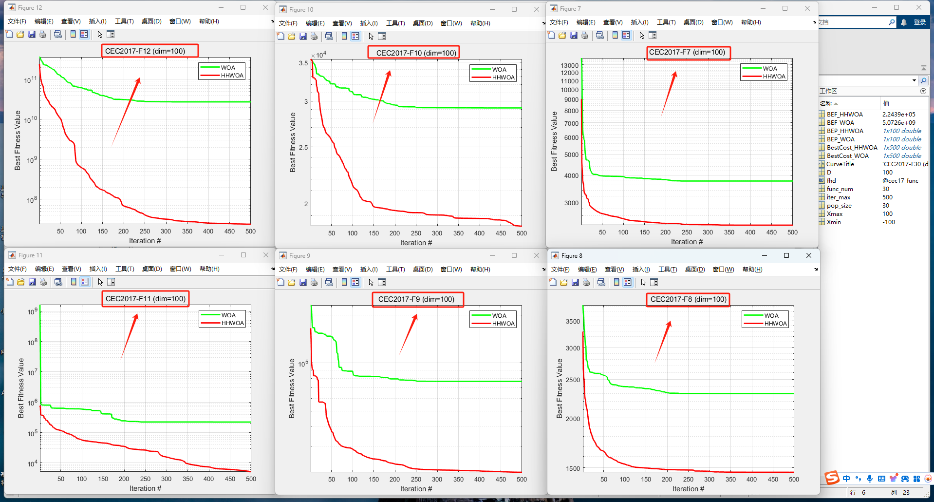 多策略改进鲸鱼优化算法(HHWOA)与鲸鱼优化算法(WOA)在CEC2017测试集函数F1-F30的寻优对比研究