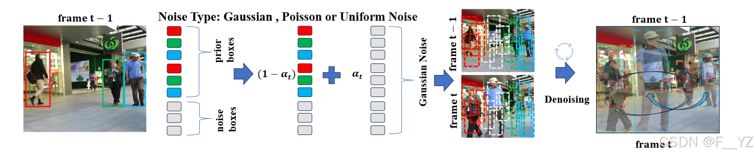 (在训练期间,噪声框是通过将高斯噪声添加到同一对象的成对真值框来构建的。在推理中,噪声框是通过将高斯噪声添加到前一帧中填充的先验对象框来构建的。)