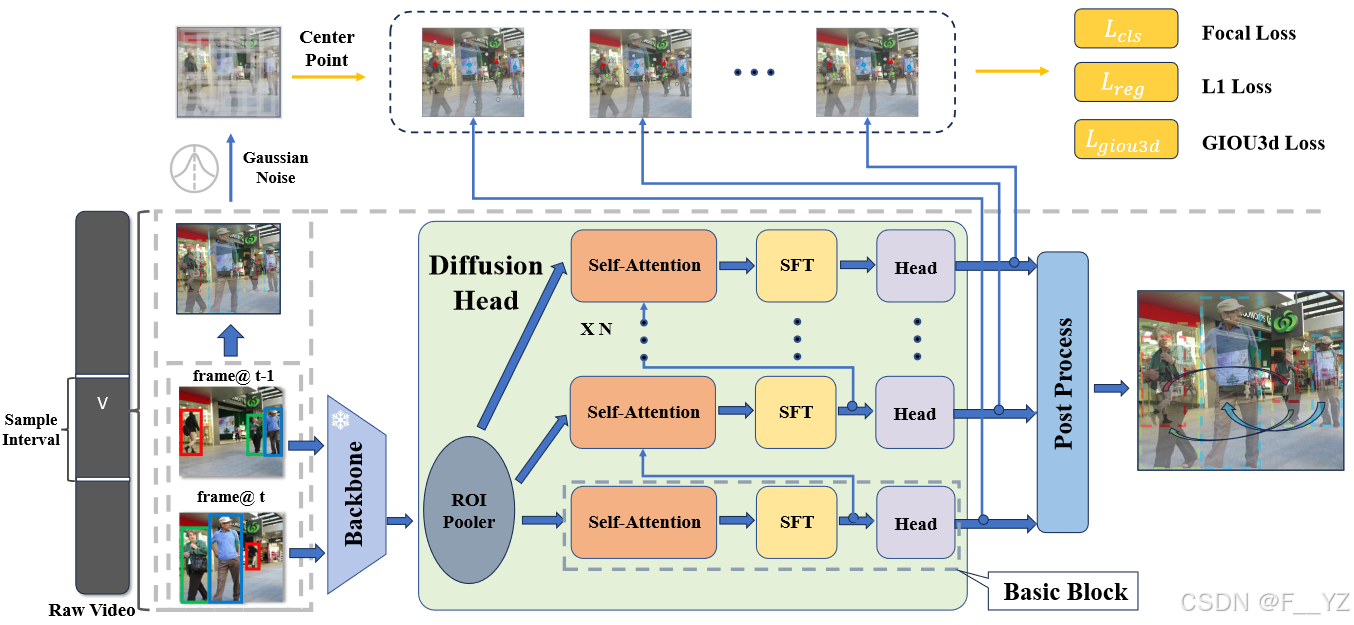 Diffusion head:diffusion head 以一组提议框作为输入,从 backbone 生成的特征图中裁剪 RoI 特征,并将这些 RoI 特征发送到不同的块,分别获得框回归、分类结果和关联置信度分数。为了解决对象跟踪问题,作者为扩散头的每个块添加了一个时空融合模块 (STF) 和一个关联评分头。