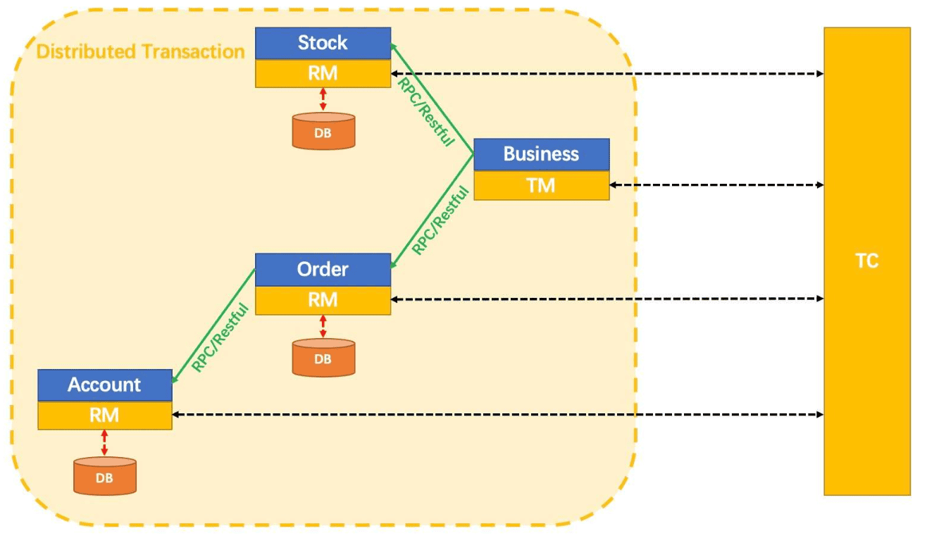TC (Transaction Coordinator) - 事务协调者:维护全局和分支事务的状态,驱动全局事务提交或回滚。