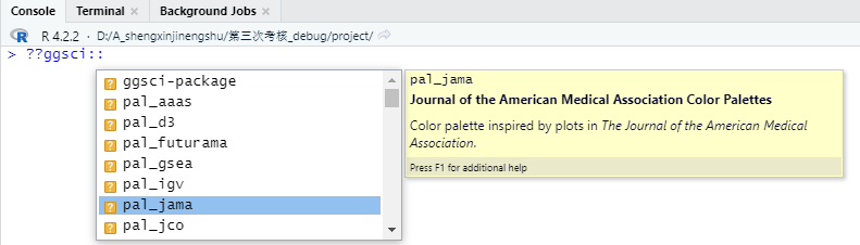 - 通过R语言自带的代码提醒功能,在Rstudio下面,即"Console"中输入“??ggsci::”,在出现的提示下拉菜单中选择想尝试的期刊即可;