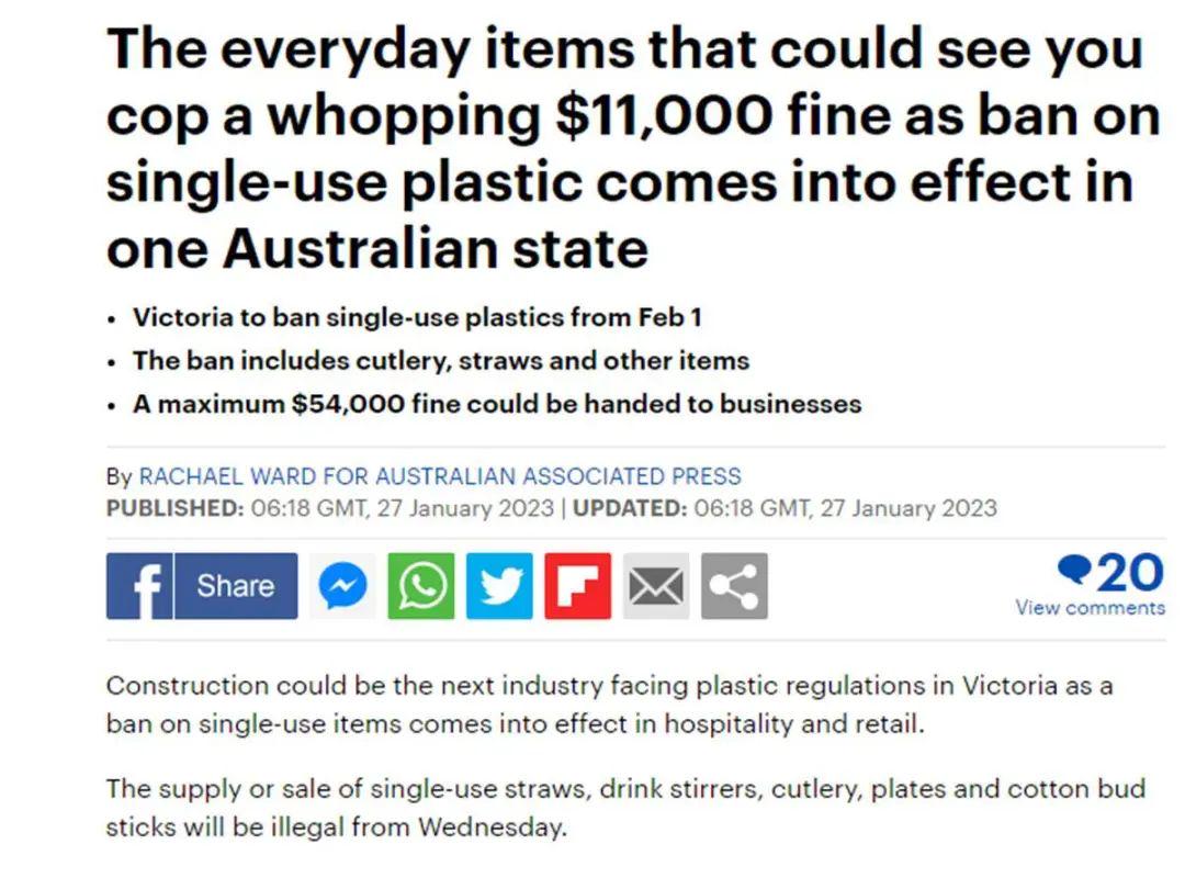 【澳大利亚一州将禁用一次性塑料制品,违者最高罚36.6万元】