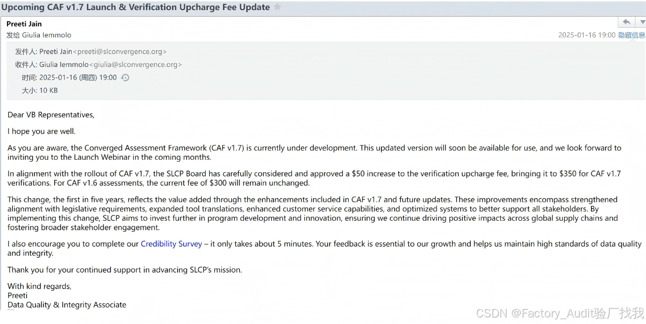社会责任审核标准SLCP,(全称为Social & Labor Convergence Program),在2025年迎来了平台的再一次提升,聚合评估框架(CAF v1.7),作为最新的版本,将很快可用。验证审核机构每做一次验证审计,就需要向SLCP平台开发方缴纳300美金的费用,(也称为平台管理费,或者平台使用费)。在迎来CAF v1.7之际,这个费用将会再次有所增加。