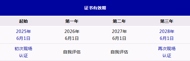 证书有效期为三年 。可参考下图,建议在证书到期前至少提前60天联系第三方安排认证事宜。