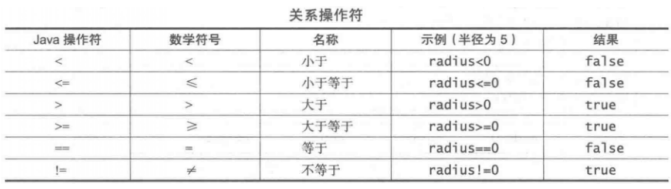 Java 提供六种关系操作符( relational operator) ,也称为比较操作符( comparison operator),用于两个值的比较(假设表中的半径值为 5 )。