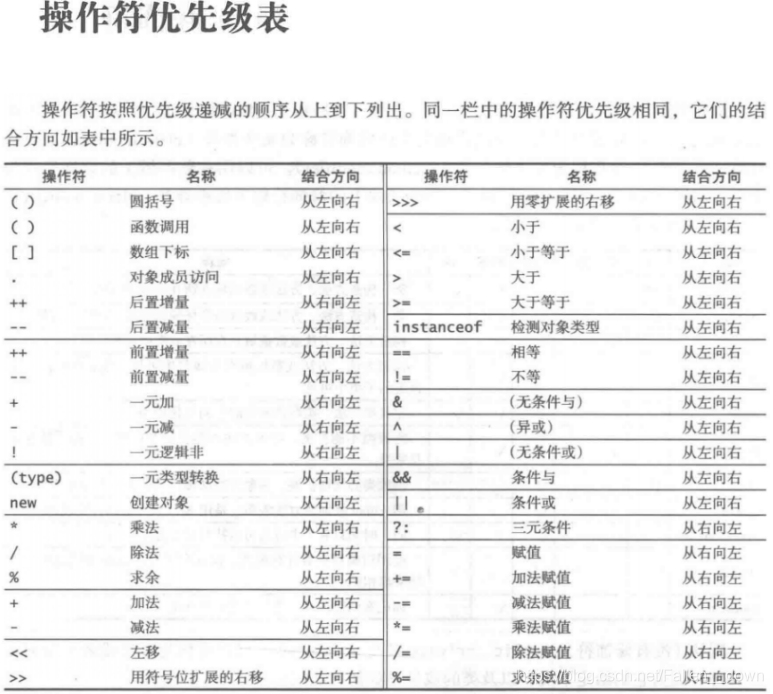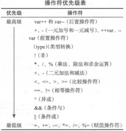 优先级规则定义了操作符的先后次序,如表所示,它包含了目前所学的所有操作符。它们从上到下按优先级递减的方式排列。逻辑操作符的优先级比关系操作符的低,而关系操作符的优先级比算术操作符的低。优先级相同的操作符排在同一行。(Java 操作符及其优先级的完整列表参见附录。)