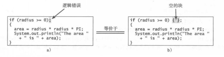这个错误是很难发现的,因为它既不是编译错误也不是运行错误,而是一个逻辑错误。图 a 中的代码等价于一个带空块的图 b 中的代码。