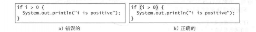 布尔表达式应该用括号括住。例如:下面图 a 中的代码是错误的。应该将它改为如图 b 所示。