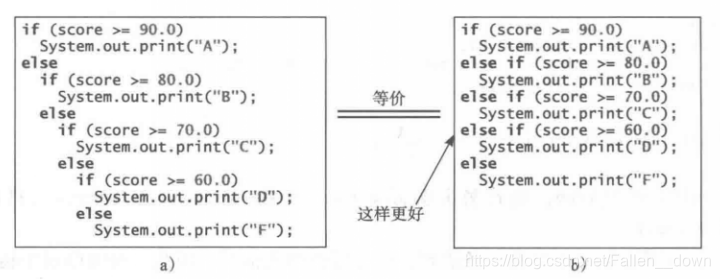 下面图 a 中的代码有两个 if 子句和一个 else 子句。那么,哪个 if 子句和这个 else 匹配呢?这里的缩进表明 else 子句匹配第一个 if 子句。但是,else 实际匹配的是第二个 if 子句。这种现象就称为悬空 else 歧义(dangling-else ambiguity)。在同一个块中,else 总是和离它最近的 if 子句匹配。这样,图 a 中的语句就等价于图 b 中的语句。