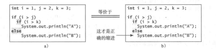 由于(i>j)为假,所以图 a 和图 b 中的语句不打印任何东西。为强制这个 else 匹配第一个 if 子句,必须添加一对花括号。