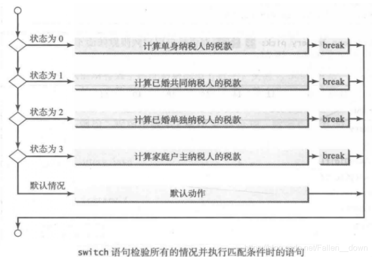 这条语句依次检査 status 是否能匹配 0、1、2 或 3。如果匹配,就计算相应的税金;如果不匹配,就显示一条消息。下面是 switch 语句的完整语法: