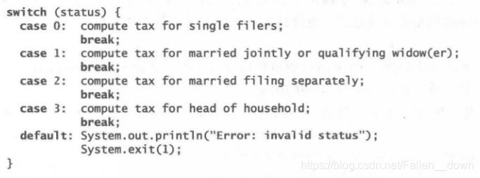 if 语句是根据单独的一个 true 或 false 条件做出选择的。根据变量 status 的值,会有多种计算的情况。为了全面考虑所有的情况,需要使用嵌套的 if 语句。过多地使用嵌套的 if 语句会使程序很难阅读。Java 提供 switch 语句来有效地处理多重条件的问题。可以使用下述 switch 语句替换嵌套 if 语句: