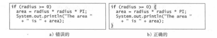 如果块中只有一条语句,就可以忽略花括号。但是,当需要用花括号将多条语句括在一起时,忘记花括号是一个常见的程序设计错误。如果通过在没有花括号的 if 语句中添加一条新语句来修改代码,就必须插入花括号。例如:下面图 a 中的代码是错误的。应该用花括号将多个语句放在一起,如图 b 所示: