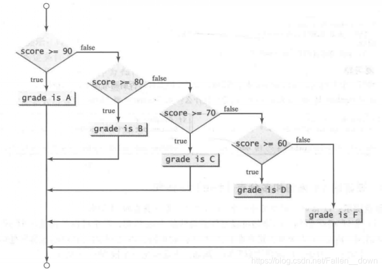 嵌套的 if 语句可用于实现多重选择。例如:下图中所给出的语句使用了多重选择, 根据分数给变量 grade 赋一个用字母表示的级别。