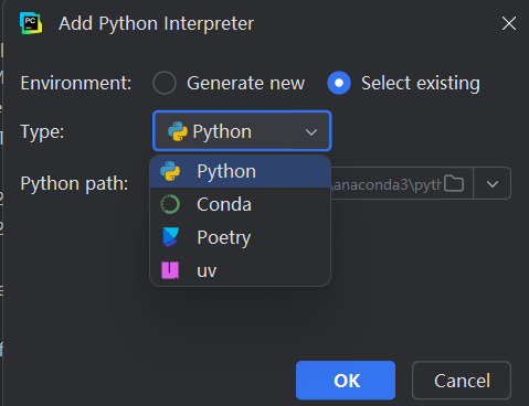 Python的路径就是你的Conda根目录\envs\你的环境别名\python.exe,点击确定即可添加。