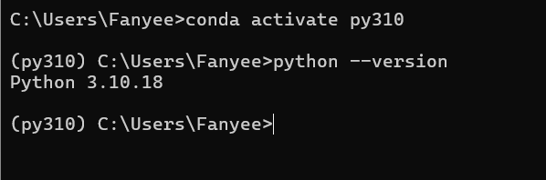 就进入到了Python3.10的环境,py310就是之前取的别名之后的一切命令将在该环境下运行,比如pip安装库等,只为这个环境进行操作,这样就做到了环境隔离。我们可以输入以下命令查看Python的版本是否是3.10。