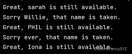 print(f"Great, {new_user} is still available.")