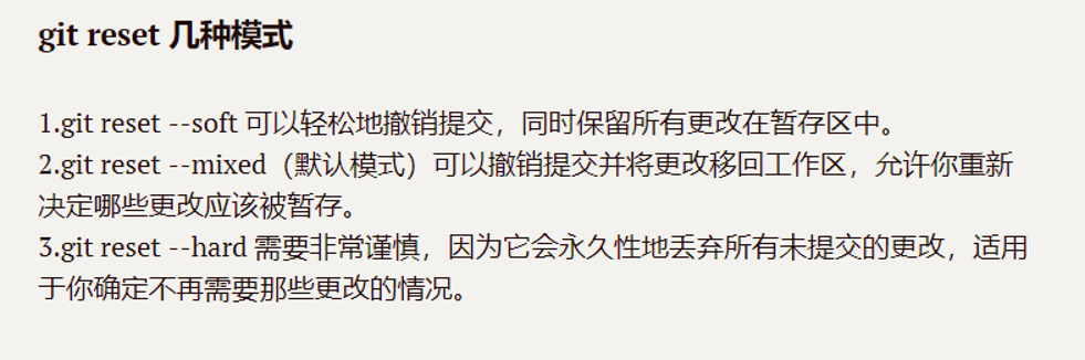 - git reset --hard 需要非常谨慎,因为它会永久性地丢弃所有未提交的更改,适用于你确定不再需要那些更改的情况。