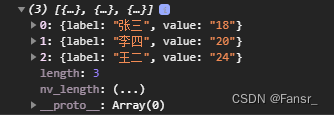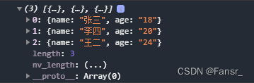 let arr=[{'name':'张三','age':'18'},{'name':'李四','age':'20'},{'name':'王二','age':'24'}]