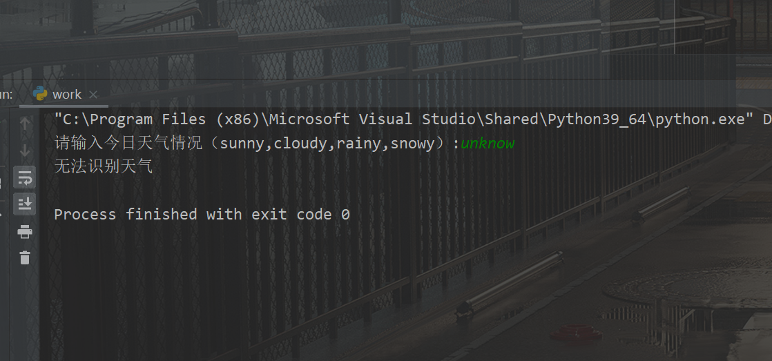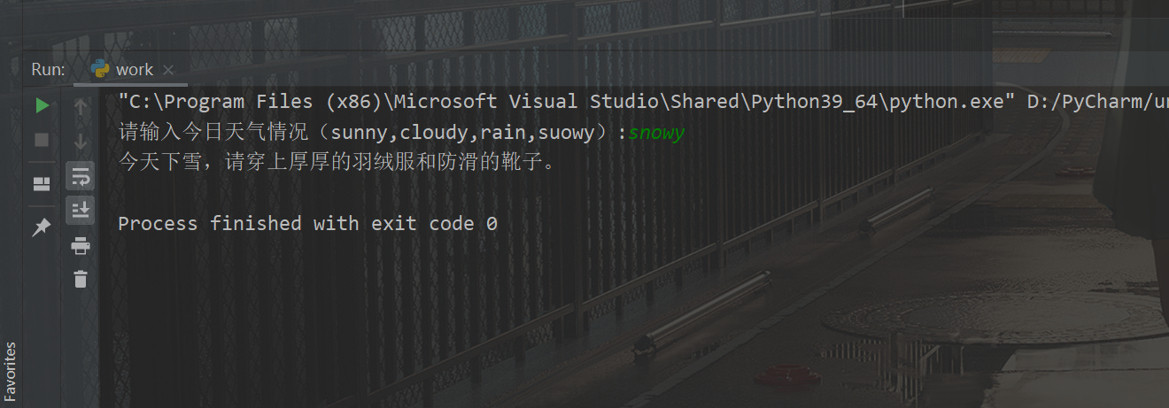 weather = input("请输入今日天气情况(sunny,cloudy,rainy,snowy):")