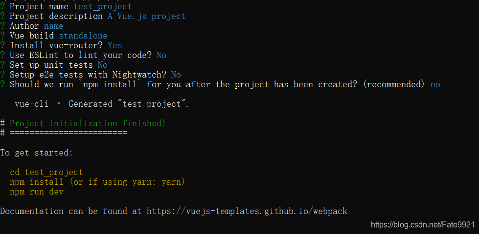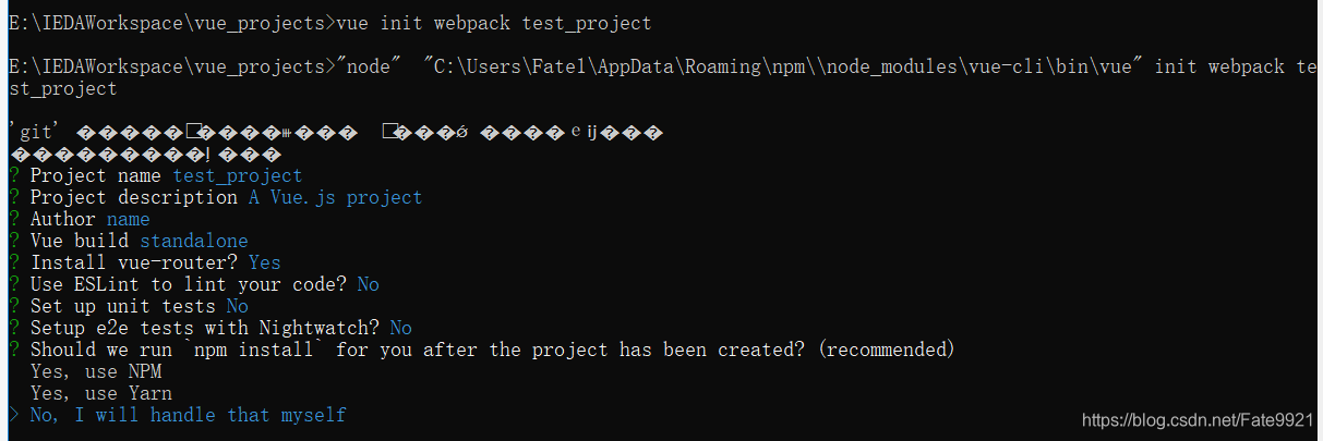 vue init webpack project_name //注:project_name为项目名称,自定义即可