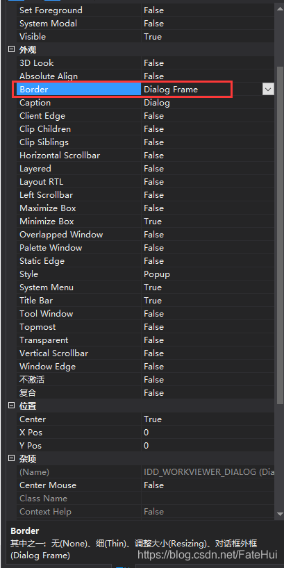 不需要写任何代码禁止MFC改变窗口大小,只需要修改对话框外观的Border属性为Dialog Frame。