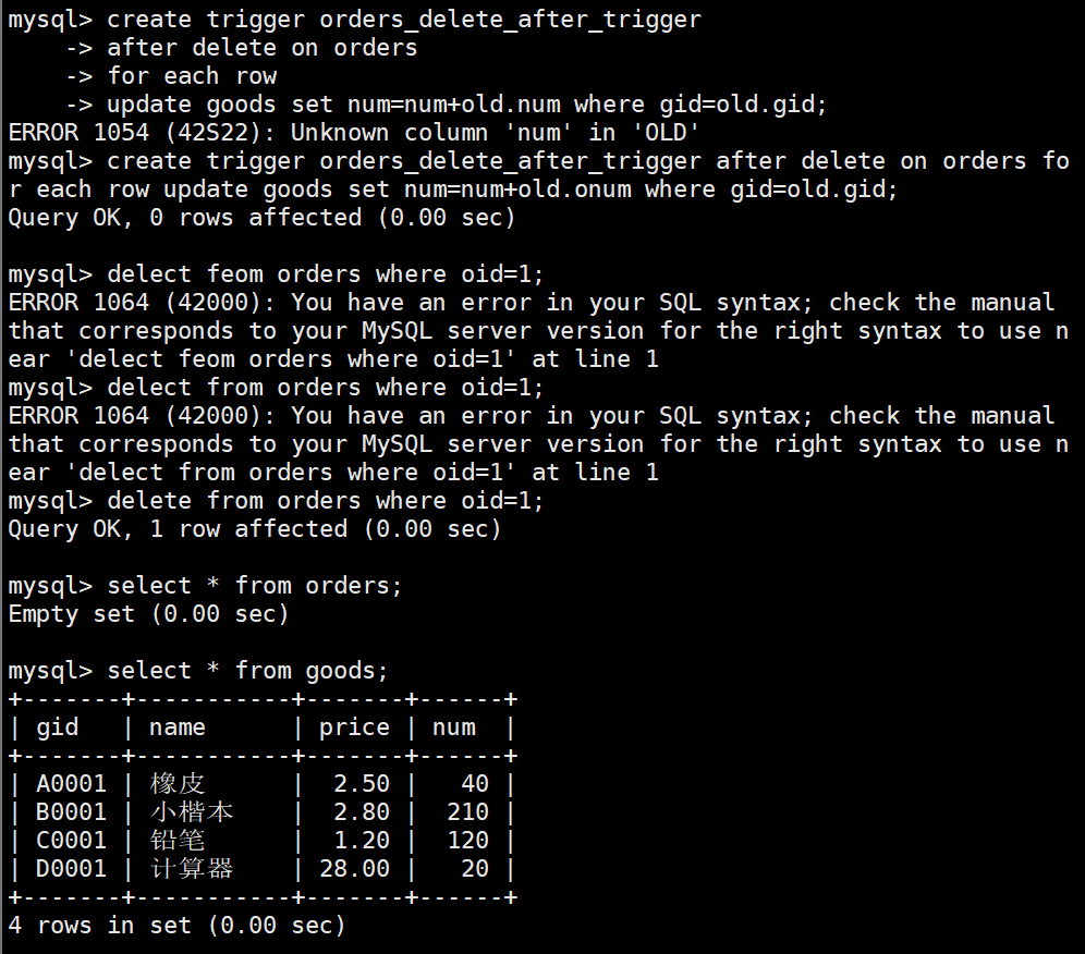 2.建立触发器,实现功能:客户取消订单,恢复商品表对应商品的数量