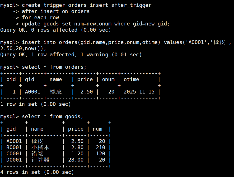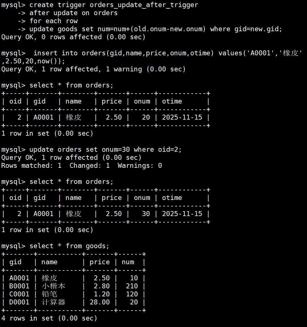 3.建立触发器,实现功能:客户修改订单,商品表对应商品数量同步更新