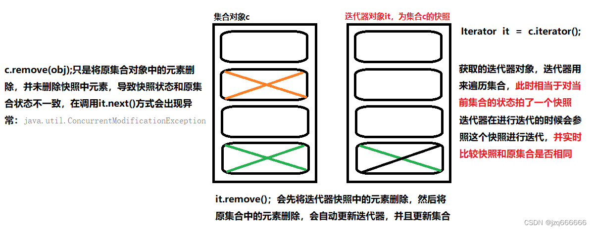 - 在迭代集合元素的过程中,一定要使用迭代器对象的remove() 方法来删除元素,不能使用集合对象的remove()方法来删除元素