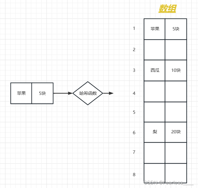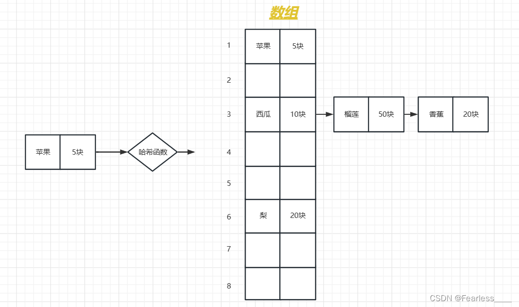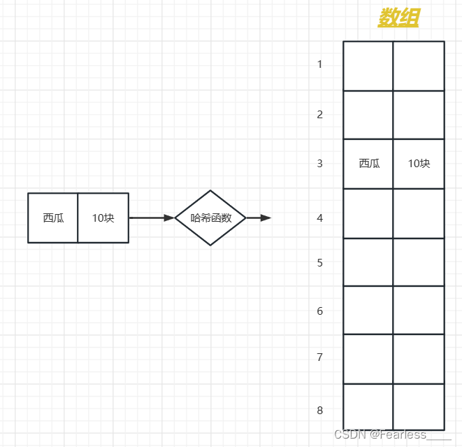我们先来简单了解下哈希表的原理,下图中有一个数组,数组元素是键值对(为了对接HashMap,哈希表不一定存储键值对,其实可以简单的理解为:存储键值对的哈希表就是HashMap),当一个键值对到来时(西瓜是键,10块是值),通过一个哈希函数,计算出键(西瓜)所对应的哈希值(为3),将该键值对存储在数组下标为3的位置,按此原理继续添加几个键值对