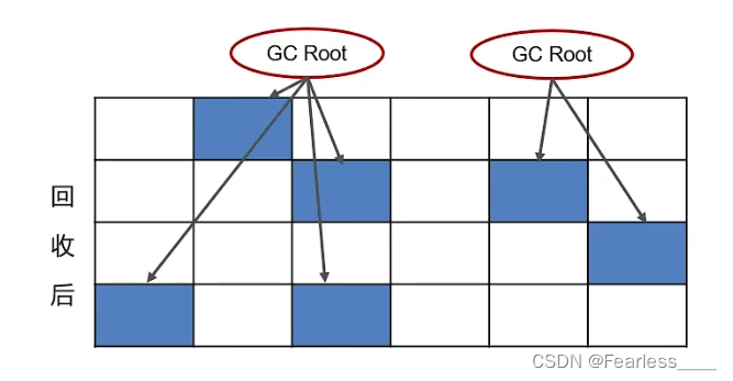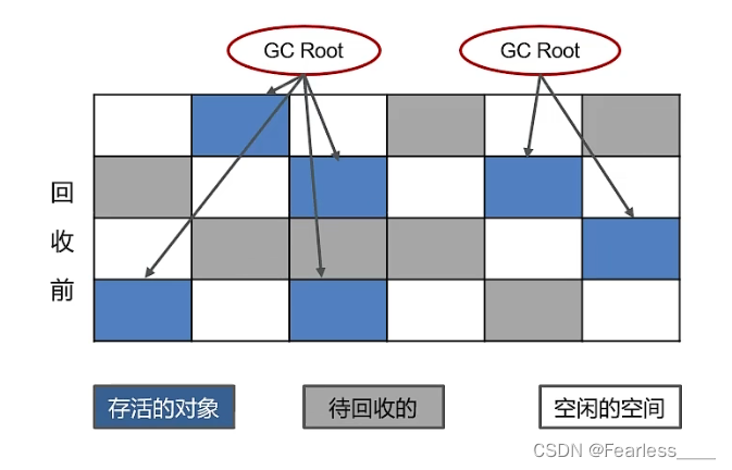 看下面的示意图,这个代表堆中的某块空间(可以是年轻代或老年代),每个紫色方块就是一个对象,上面我们说,JVM的对象是否存活的判定方法是可达性分析,所有那些没被GC Root引用的就要给标记成垃圾对象,标记完后再统一进行回收,这会造成内存空间碎片化的问题