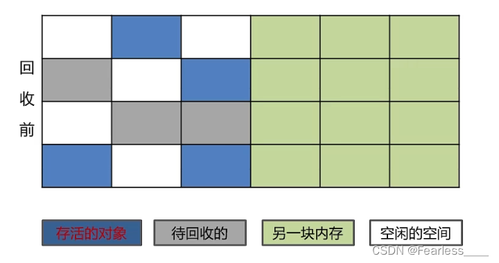 将堆区分为两块区域,先只在其中一块区域创建对象,垃圾回收的时候,先标记出那些不要被回收的对象,然后将其复制到另外一块区域中,然后清空原本那块区域,新生代使用的就是标记-复制算法,新生代分为一块较大的Eden空间和两块较小的 Survivor空间,每次分配内存只使用Eden和其中一块Survivor。发生垃圾搜集时,将Eden和Survivor中仍然存活的对象一次性复制到另外一块Survivor空间上,然后直接清理掉Eden和已用过的那块Survivor空间。这里存在一个问题,当存活的对象的总大小大于那块Survivor空间,那就会造成溢出,而那些溢出的对象,会直接进入老年代,这叫分配担保